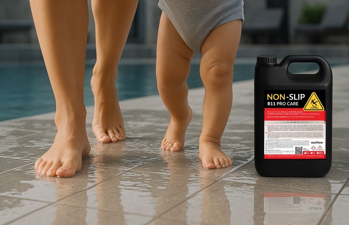 Użyj specjalistycznego preparatu Bautech NON-SLIP PRO CARE R11 i wyeliminuj zagrożenie wypadkiem w przestrzeni, za która odpowiadasz! Efekt natychmiastowy. A przy okazji odzyskaj na długo utracony blask posadzki.